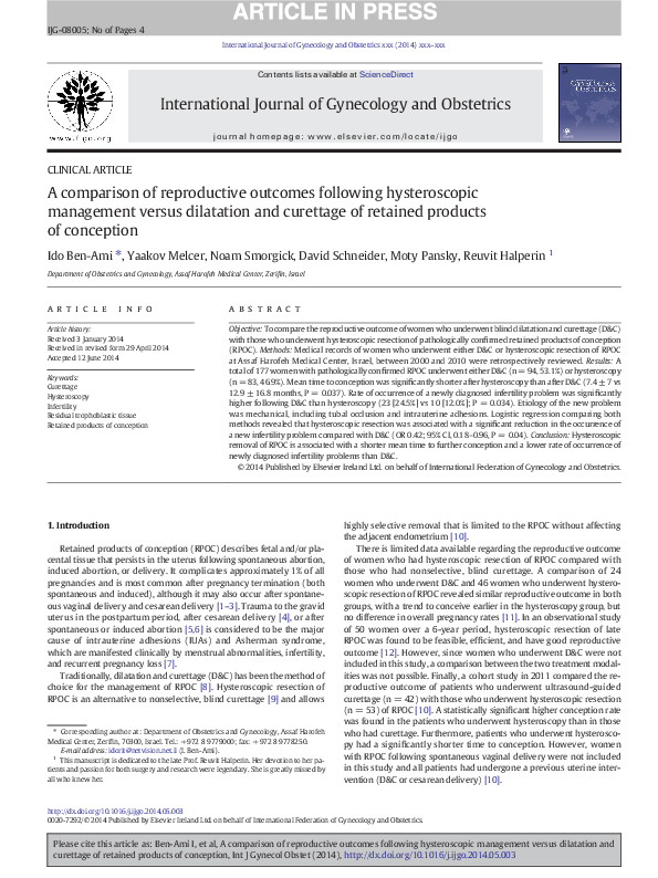 Pdf A Comparison Of Reproductive Outcomes Following Hysteroscopic Management Versus Dilatation And Curettage Of Retained Products Of Conception Moty Pansky Academia Edu